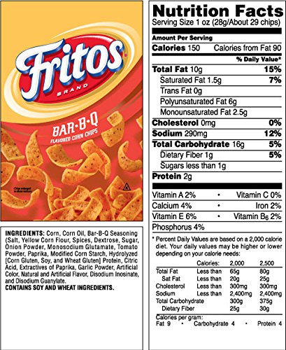 -. Binding : Misc. -. Brand : Frito Lay -. EAN : 8954736215387 -. Feature : Package of 16 bags of 2 Oz. (BBQ Corn Chips) gluten and lactose free Contains 0 grams of trans fat / The original corn chip, in a conveniently portioned snack size Made from three ingredients: corn, oil and salt and barbecue sauce. / Fritos' distinctive taste and hearty crunch make it the perfect ingredient for recipes -. ProductGroup : Grocery -. ProductTypeName : GROCERY -. Title : FRITOS BBQ Flavored Corn Chips (16 Pack - 2 Oz.)