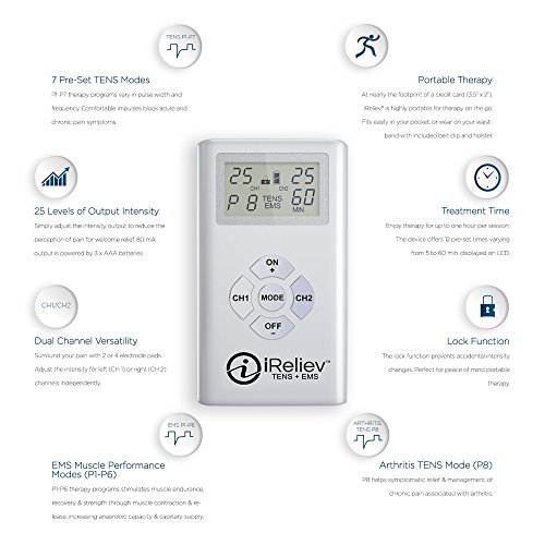 FEATURES:The iReliev Strength & Recovery System Combines TENS & EMS: Features 8 Pre-Programmed Therapy TENS Modes and 6 EMS Modes Allowing you to Customize Your Therapy Based on Acute or Chronic Pain, Arthritis. Or EMS for Strength and/or Workout Recovery. Use P8 for Arthritis. RX Equivalent Output Intensity Offer 25 Levels.