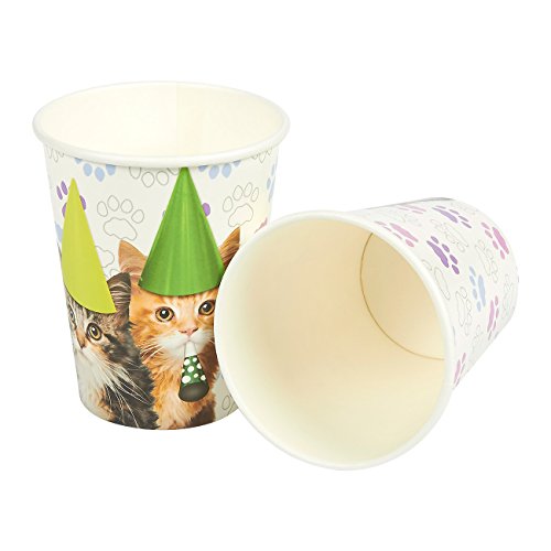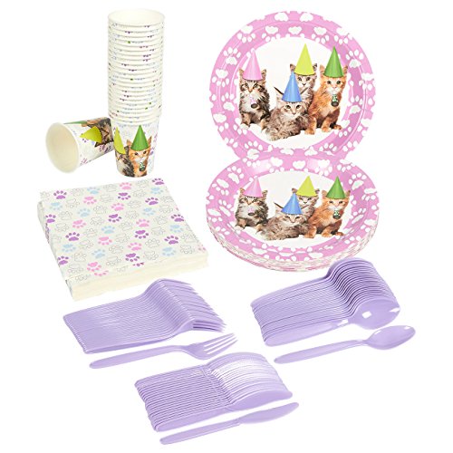 -. Feature : SERVES 24: This kitten themed set includes enough tableware for 24 guests; contains 24 of each of the following: Plastic Knives, Spoons, Forks and Paper Plates, Napkins and Cups. The plastic silverware is in light purple while the paper plates, napkins and cups are in various colors. Four kittens wearing party hats are depicted on the plates and cups while the napkins feature kitten paw P.R.Ints in various shades of purple and blue. / HIGH QUALITY: Plates are thick and rigid and won't fold while carrying food. Napkins are soft and absorbent--a pleasure to use. / SAFE & ENVIRONMENTALLY FRIENDLY: Flatware set is 100% Food Grade and BPA-Free. Plates, Cups and Napkins are made of environmentally friendly biodegradable paper. / GREAT FOR ALL OCCASIONS: Suitable for all occasions including parties, catering, outdoor events and simply just eating at home. / DIMENSIONS: Flatware is approximately 6 inches long. Paper cups hold approximately 9 oz of liquid. Napkins are 3-layer and measure 13 x 13 inches when unfolded and 6.5 x 6.5 inches folded. Plates are approximately 9 inches in diameter.