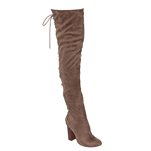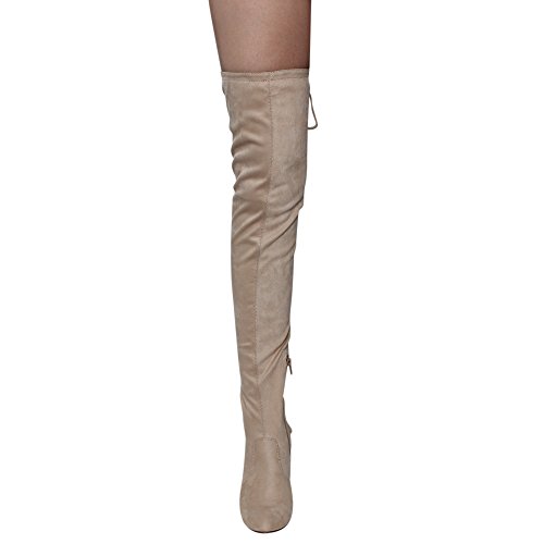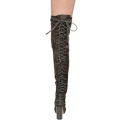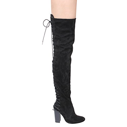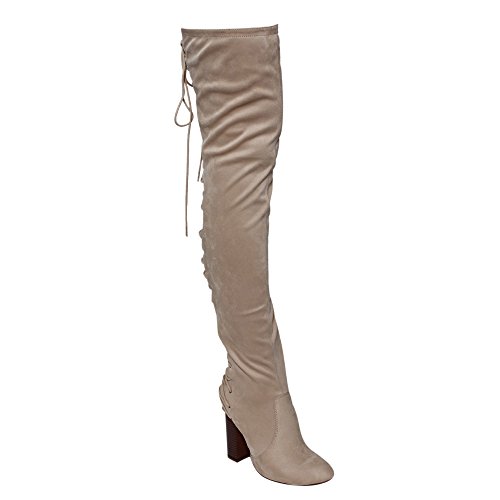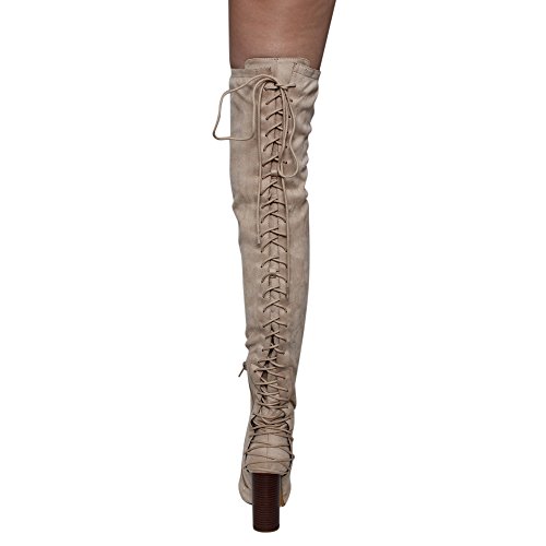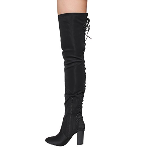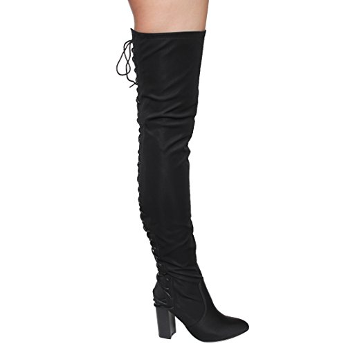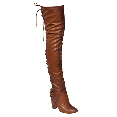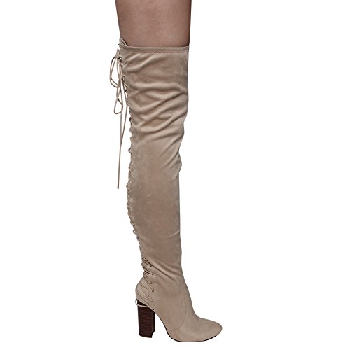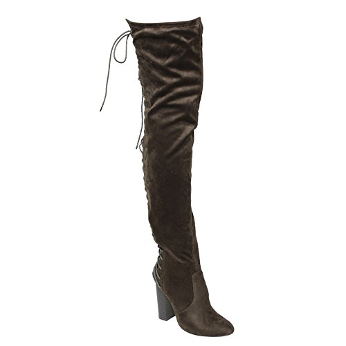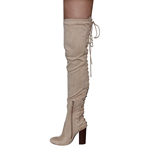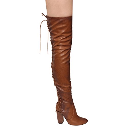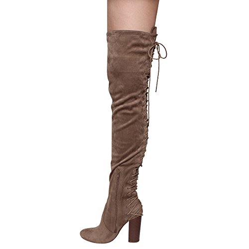 Product Description These sexy thigh high boots are featuring a back corset lace up feature, and a partial side zipper closure, finished with a high stacked heel. This style we have two materials, faux leather: black cognac; faux suede: black, olive, nude taupe. 0