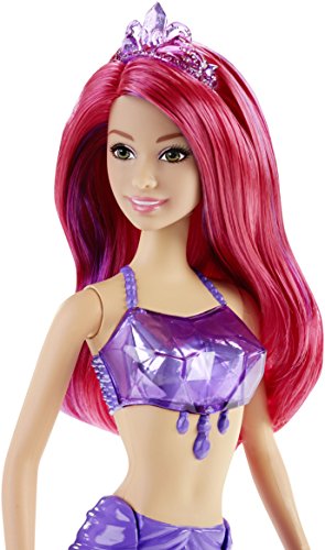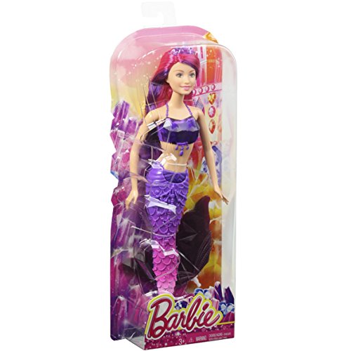 -. Binding : Toy -. Brand : Barbie -. EAN : 0887961216875 -. Feature : This wonderfully colorful mermaid makes a marvelous splash in the sea! / A gorgeously decorated tail, exquisitely detailed top and color-streaked hair set imaginations sailing! / Inspired by her fairytale gem kingdom, she wears a glittery purple bodice with sparkling sculpted "gems" and has a pink and purple hombre tail / A removable matching hairpiece is adorable in her pink- and purple-streaked hair / Collect all of the Barbie fairytale dolls for endless storytelling possibilities (each sold separately, subject to availability) -. IsAdultProduct : 0 -. Label : Mattel -. LegalDisclaimer : WARNING: CHOKING HAZARD - Small parts or small parts maybe generated. Not for children under 3 years. -. Manufacturer : Mattel -. Model : DHM48 -. MPN : DHM48 -. NumberOfItems : 1 -. PackageQuantity : 1 -. PartNumber : DHM48 -. ProductGroup : Toy -. ProductTypeName : TOYS_AND_GAMES -. Publisher : Mattel -. Studio : Mattel -. Title : Barbie Mermaid Doll, Gem Fashion -. UPC : 887961216875 -. Warranty : 1 year warranty against manufacturer defects