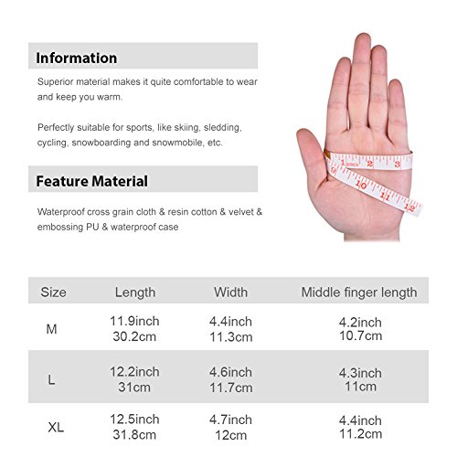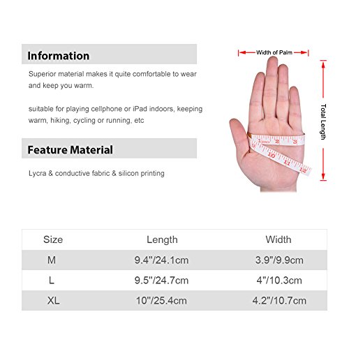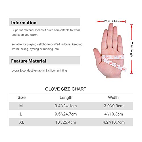 Information The latest Vbiger multi-function winter warm gloves! You can wear our gloves playing cellphone or iPad indoors in winter, keeping you warm; also, it's best suitable for outdoor sports, running, biking or hiking, etc. If you want to know more details or have any questions, please look through the detailed page or contact the customer service. Feature Material: Lycra conductive fabric silicon printing Size chart: M: length 9.4"/24.1cm, width 3.9"/9.9cm L: length 9.5"/24.7cm, width 4"/10.3cm XL: length 10"/25.4cm, width 4.2"/10.7cm Gender: Unisex Application: suitable for playing cellphone or iPad indoors, keeping warm, hiking, cycling or running, etc Color: as picture shown Package list: a pair of gloves Notice * The actual color may vary slightly from the online image due to monitor color settings. * Please allow slight measurement deviation for the data. 0