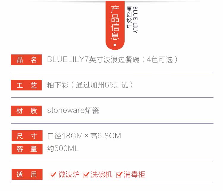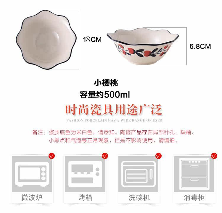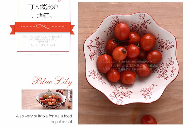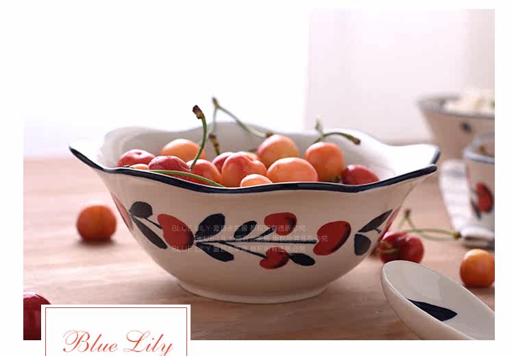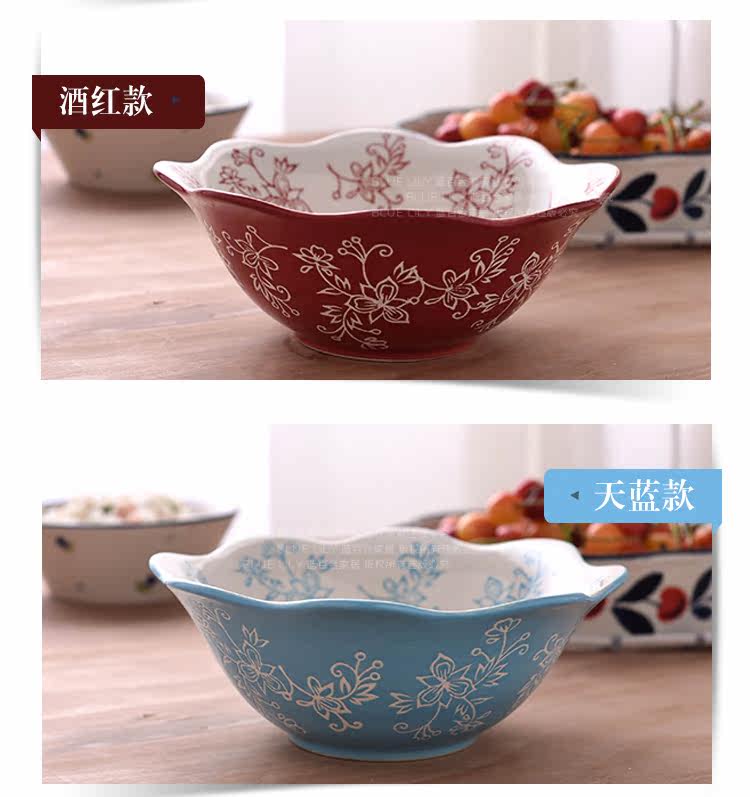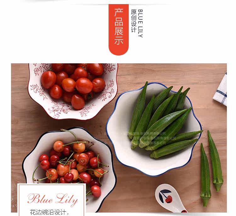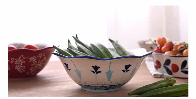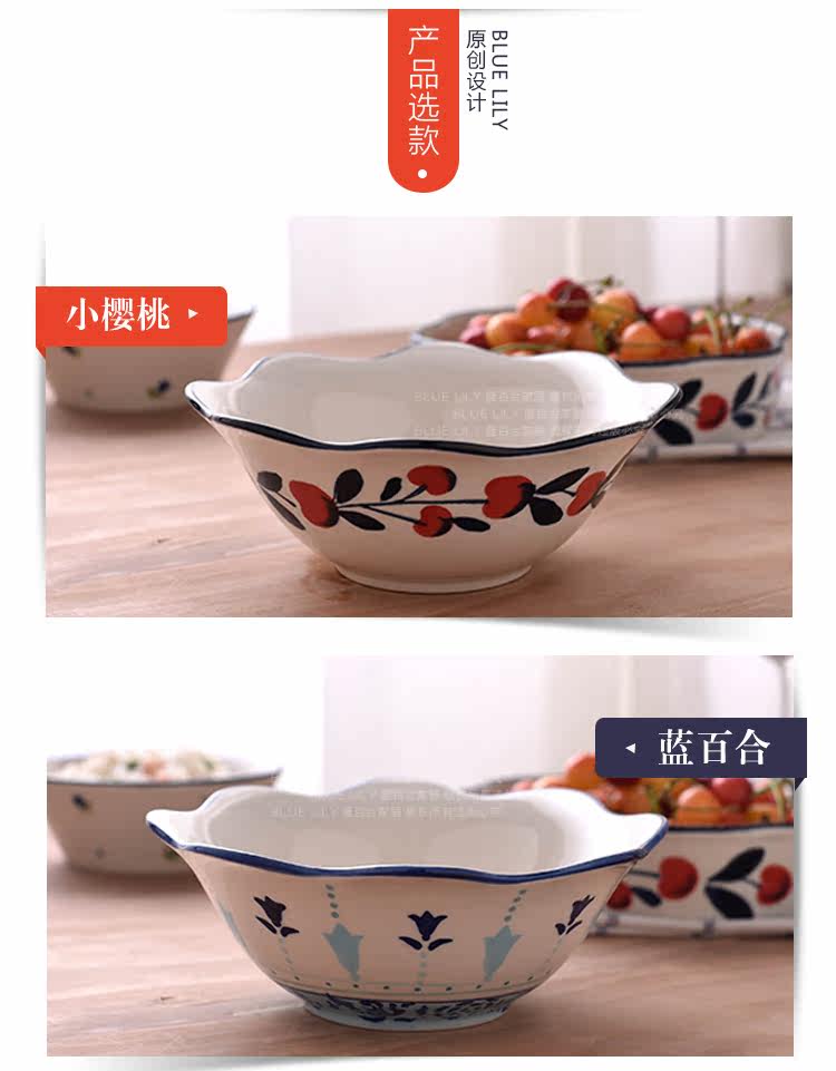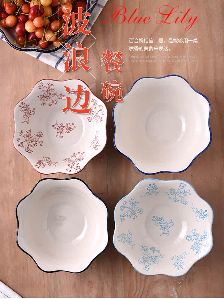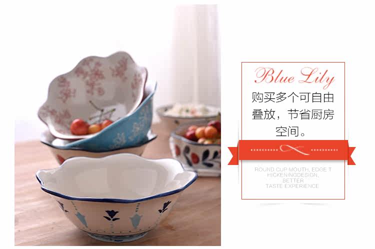 蓝百合创意美式手绘釉下彩陶瓷碗花边碗家用汤碗水果沙拉碗面碗