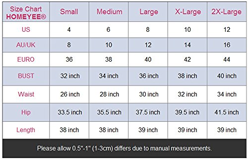 Please allow 0.5 inch-1 inch differs due to manual measurements, your understand will be much appreciated!!! About us: HOMEYEE specializes in designing, manufacturing and selling woman's apparel and enjoys a high reputation with its excellent quality, reliable delivery and good customer service at home and aboard. 0