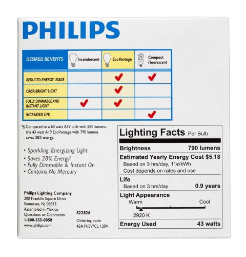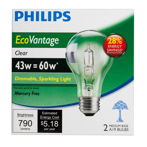 Studio : Philips Publisher : Philips Binding : Tools Home Improvement Product Description Philips EcoVantage 43-Watt Clear A19 household light bulb two-pack is ideal for use in living rooms, bedrooms, hallways, bathrooms, dining rooms, offices, kitchens. Philips EcoVantage bulbs are a bright, energy saving alternative to standard incandescent light bulbs. The bulbs’ clear finish adds a decorative sparkle to your room. They reduce energy consumption without sacrificing the qualities of a traditional bulb and produce high quality light more efficiently. Fully dimmable, this energy saving household light bulb contains no mercury and replaces your current 60-Watt incandescent, saving you up to 28% in energy costs. Use them in your existing fixtures just as you would standard incandescent and your home will look great while you save energy. 0