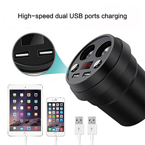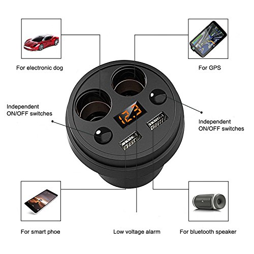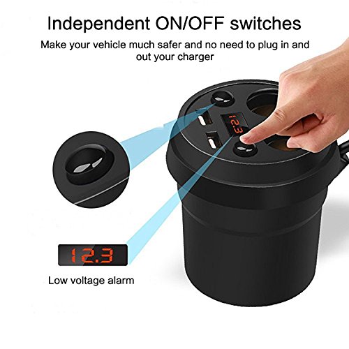 - ★ SLEEK DESIGN --- Designed to fit your car or truck’s cup holder, which makes your car much neater. 2-Socket Cigarette Lighter Allow you plug in more than one thing at a time. 2 independent on/off switchs for 2 socket cigarette lighters for safe operation, no need to plug in and out your charger, reduce wear and tear, expanding lifespan of the device.