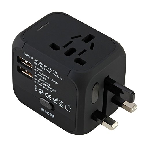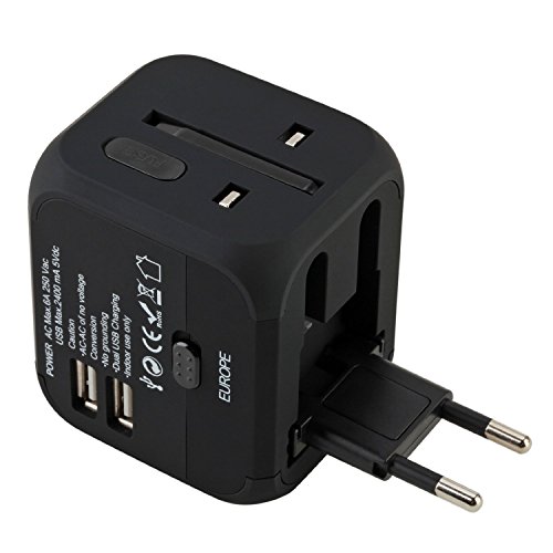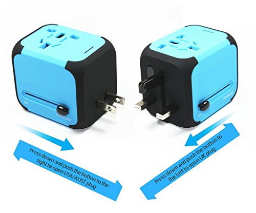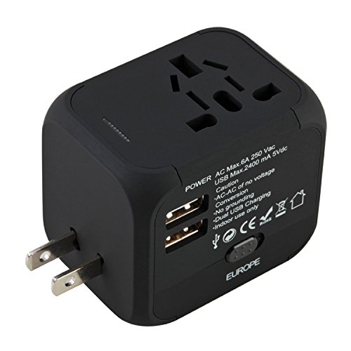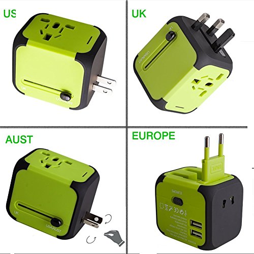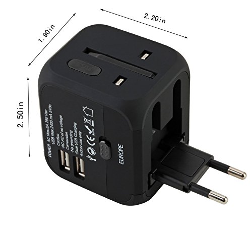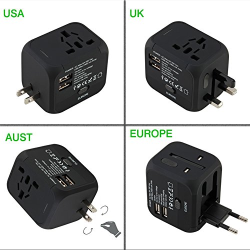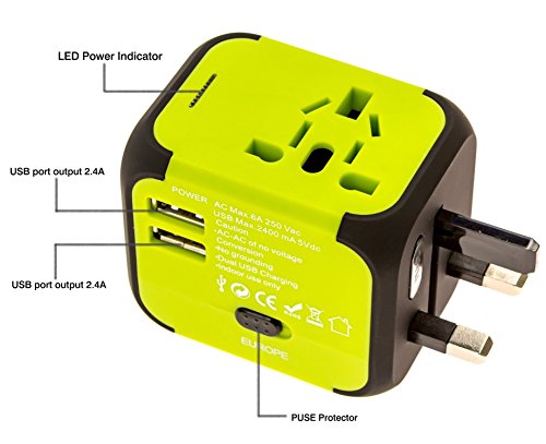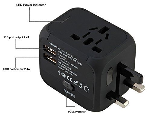 -. Feature : WORLDWIDE CHARGING - Get charged in over 150 Countries with US UK EU & AUS/CHINA Plugs. This adapter works in Canada, Russia, Asia, Central America, South America and the Middle East..etc / Dual USB port and one AC socket to charge three devices at one time Improved Electronics, a less bright LED, Stronger Sliders, Safety Shutters, Plug Lock System, 6.0 Amp Fuse + Built-in Spare. Free 18-Month Warranty included. FCC CE and RoHS Certified / POWER UP YOUR TECH -This Travel Adapter will charge almost all USB powered Devices: Apple iPhone, iPad, iPod, Samsung Galaxy , Sony, Blackberry, HTC, Lenovo, LG, ZTE, Huawei, MP3 Players, Bluetooth Speakers, Tablets, Smart Phones, Headphones, Power Banks and Sat-Nav systems. / Travel friendly: Compact and lightweight. Optimized to deliver fast, safe and efficient charging. Thanks to the unique look of this worldwide adapter you are far less likely to forget or lose this adapter in your hotel room while traveling. It also makes a great travel gift. / We understand that electronics are must needed to be safe, that is why this all in one charger has a built in fuse to protect you from any shortages. Please note that all in one travel adapters do not convert voltage.