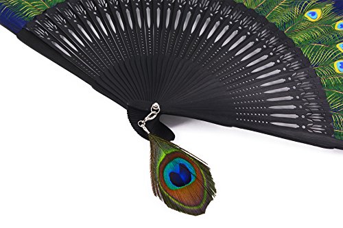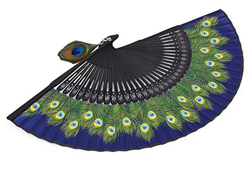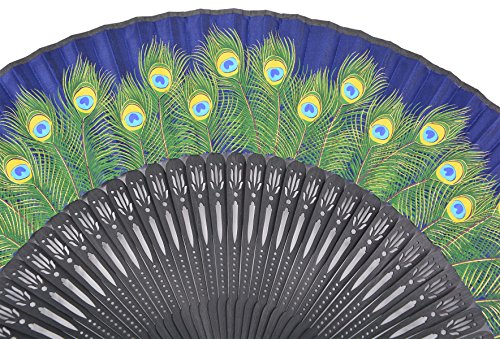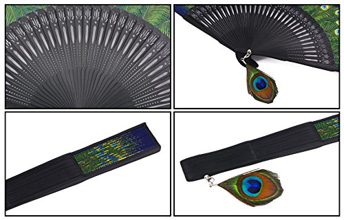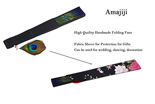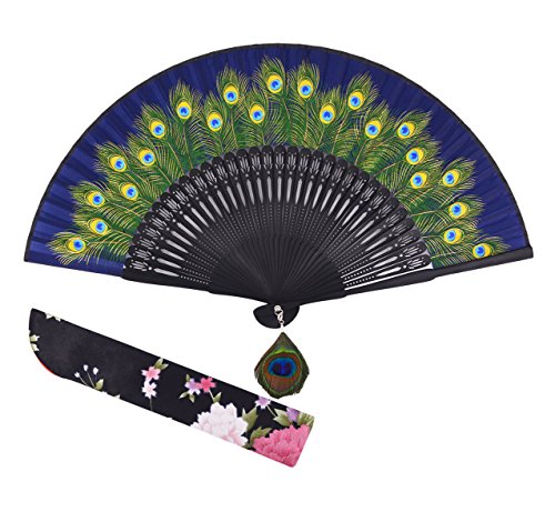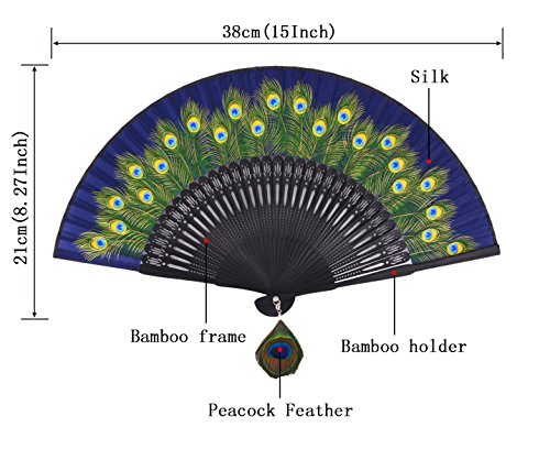 Amajiji 8.27" Peacock Chinease/Japanese Hand Held Silk Folding Fan with Bamboo Frame,Hollow Carve Patterns Bamboo Frame Women Hand Folding Fans Hand Fan Gift fan Craft fan Folding Fan (Blue)
