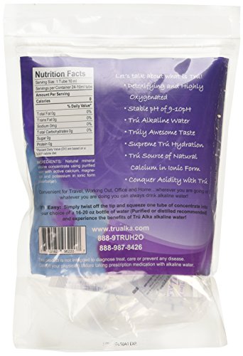 -. Binding : Health and Beauty -. Brand : TruAlka -. EAN : 0654367297247 -. Feature : Truly Stable 9-10pH with Negative (-) Ions (ORP) / Tru Hydration / Truly Smooth and Awesome Taste / Enhanced With Electrolytes / Helps To Maintain An Alkaline Enviroment -. IsAdultProduct : 0 -. Label : The Water Loft, LLC -. LegalDisclaimer : Please use this product with purified water only!! Do not use with natural sP.R.Ing water products. -. Manufacturer : The Water Loft, LLC -. PackageQuantity : 1 -. ProductGroup : Health and Beauty -. ProductTypeName : HEALTH_PERSONAL_CARE -. Publisher : The Water Loft, LLC -. Studio : The Water Loft, LLC -. Title : Tru Alka Mini Pods - Alkaline Ph Booster Concentrate (Instantly Convert Any Purified Water to a 9-10 pH) -. UPC : 654367297247