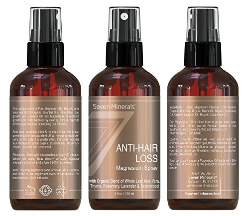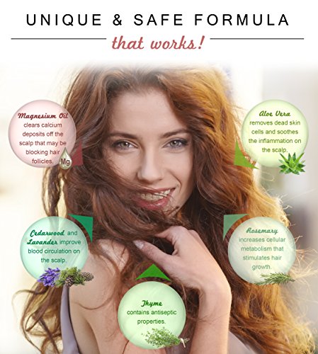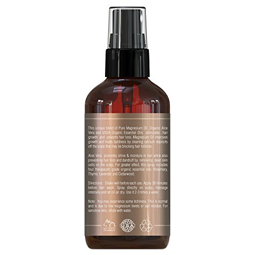 [Description] NO TOXIC CHEMICALS: No sulphates_ parabens or toxic chemicals. Just scalp food. The combination of Pure Magnesium + Organic Aloe Vera + Essential Oils is all you need to start unblocking and feeding the roots. So you can boost natural the hair growth cycle IT WORKS: Our hair follicles can get blocked with things like calcium deposits_ dandruff_ dead skin. And they get inflamed. A magnesium treatment like this_ helps to unblock the follicles_ and nourish the scalp. This is a a unique_ all natural formula that works! 100% NATURAL WITH ORGANICS: Made in the USA_ with ionic Magnesium from 250million year old Permien Seabeds. USP Grade_ No Animal Testing. Natural ingredients soothe the scalp_ reduce inflammation and unblock hair follicles. GUARANTEE: Allow 90 Days for the follicles to ``wake up`` and start producing new hair growth. And if by some chance_ you``re not happy_ please return for a full refund. HAIR FOLLICLE DETOX: This is no hair growth solution that just adds thickness to your existing hair - this is an all natural_ chemical free makeover for your scalp. Buy Now. CAUTION : No one with kidney failure should use any Magnesium products. If you are on dialysis or if your doctor has issued the warnings against supplements of any kind_ then magnesium oil should not be used; If you have low heart rates_ please consult your doctor before use as magnesium relaxes your body; Not for internal use. Keep out of reach of children. Avoid contact with eyes_ freshly shaved areas and cuts. If you have kidney failure or are pregnant_ consult your doctor before use. If irritation_ redness or discomfort occurs_ discontinue use