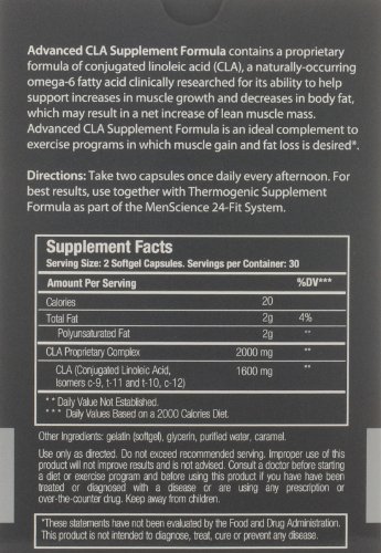 ReleaseDate : 2015-02-01 Studio : MenScience Androceuticals Publisher : MenScience Androceuticals Binding : Health and Beauty Product Description CLA supplement for men. Burn fat and build muscle. Conjugated linoleic acid. CLA (Conjugated Linoleic Acid) helps bolster muscle growth and decreases in bodily fat, resulting in a net increase in lean muscle mass. This proprietary formulation provides an ideal dose of 1600 mg derived from natural Omega-6 fatty acids and is 100% free of stimulants. It is an ideal complement for exercise programs. 0