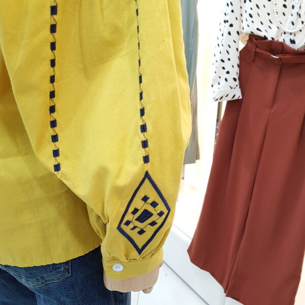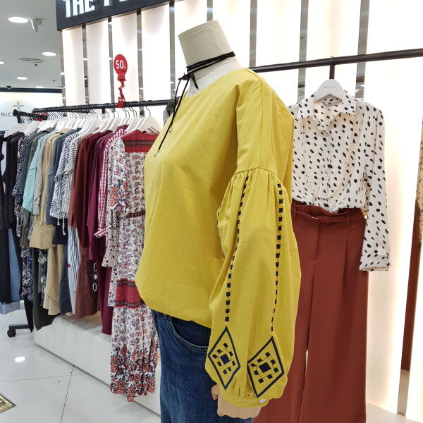 면100%의 쾌적한 소재감과 박시한 핏감으로 편안하고 체형커버에 도움을 주는 오버핏블라우스아이템입니다.루즈한 어깨라인의 볼륨감있는 퍼프소매단에 크고작은 다이아자수패턴으로 러블리하면서 큐티함까지 더해준 제품입니다.