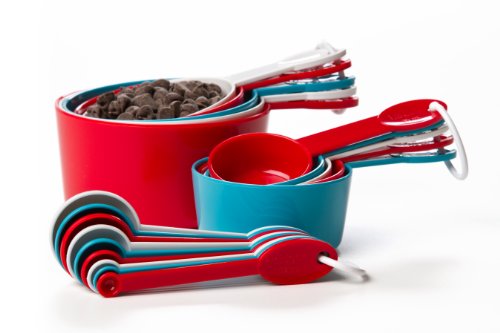 - Feature : Comprehensive 19-piece kitchen measuring set in red, white and teal; standard and metric measurements / Cup measurements: 1/8, 1/4, 1/3, 1/2, 2/3, 3/4, 1, 1-1/2, 1-3/4 and 2 cups / Spoon measurements: 1/32 tsp., 1/16 tsp., 1/8 tsp., 1/4 tsp., 1/2 tsp., 1 tsp., 2 tsp., 1/2 Tbls and 1 Tbls / Large handles provide a more secure grip / All pieces are dishwasher safe