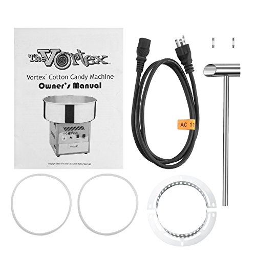 If you are in the market for a cotton candy machine, stop looking. This commercial quality Vortex Cotton Candy machine by the Great Northern Popcorn Company will make you a hit at your next party. It features an easy cleaning stainless steel kettle, an innovative storage drawer, a belt driven performance grade motor, and an industry leading 950-watt high performance heating element. With the antique style design, you will be reminiscing about your early days at the ball game, carnival, or the movie theater. We have combined the best of both worlds--not only are you getting today's technology, you get an eccentric design with all the conveniences of the modern era.A couple of conveniences worthy of note include our innovative storage drawer. Our machine was designed with a removable stainless tray to allow spare parts, scoops, cones, and more to be stored out of the way. We have also included two spare belts in the event one breaks. Dare to compare. These are proven winners and you will be making award winning cotton candy with the Vortex. We have sold thousands of these units to churches, schools, businesses, day care centers, varsity/PTA clubs, and more. Of course, our #1 customer is the home owner looking to add a theatrical effect to their home theater.Why buy the Great Northern machine?Quiet Design--Belt driven to limit vibration and noise.Premium Grade Steel- 30-percent thicker than our competitionStylish Design----compare for yourselfSafer Packing----double wall stock and extra packing to ensure a safe deliveryRicher Color----Premium paint and enhanced colorsGreat Northern Quality and Warranty.Feature