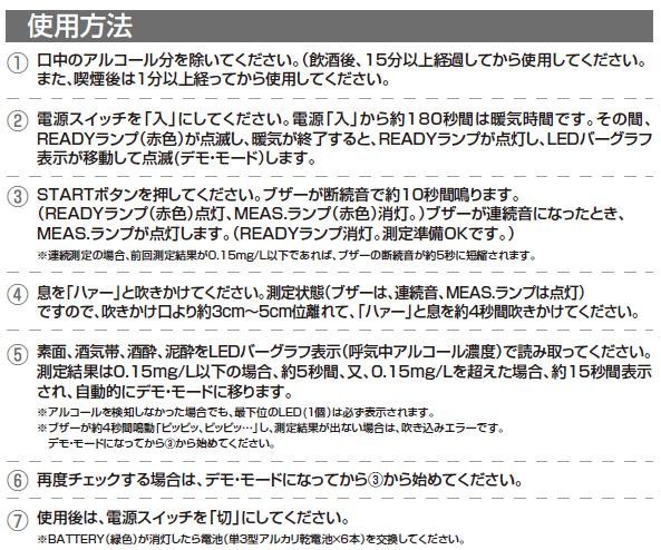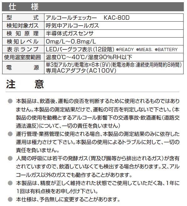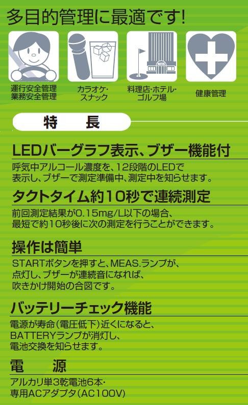 fk094igrjs息を吹きかけるだけでアルコール度をチェックできます運行・業務完全管理などに サイズ 縦205×横65×奥行112mm 個装サイズ:22×8×14cm 重量 約450g 個装重量:550g 素材・材質 ABS 付属品 専用アダプタ(AC100V)、単三型アルカリ乾電池6本、取扱説明書、保証書(1年間) 製造国 日本 簡単息を吹きかけるだけ、アルコールチェッカー 息を吹きかけるだけでアルコール度をチェックできます運行・業務完全管理などに