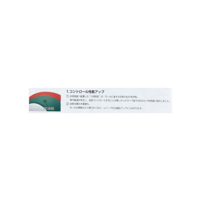 1.콘트롤 성능이 업 볼에 접하는 공기의 혼란을 억제,종래 콘트롤 하는 것이 어려웠던 서브 낙하점 노바라부를 저감합니다.