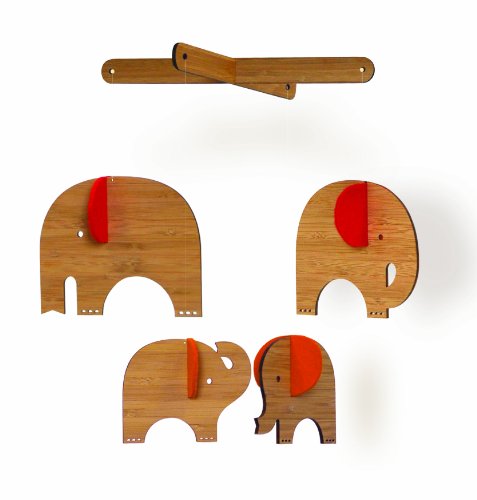 A modern addition to any child's room, this Petit Collage mobile is laser cut from sustainably harvested bamboo plywood, an earth friendly renewable resource. This deluxe bamboo mobile also features 100 percent wool felt elephant ears that easily slot into place adding a pop of color to the room. Made in the USA. and assembled by a non profit employing adults facing challenges. Includes: four elephants (2 of each size), four wool felt ears, hanging stick and string.Feature
