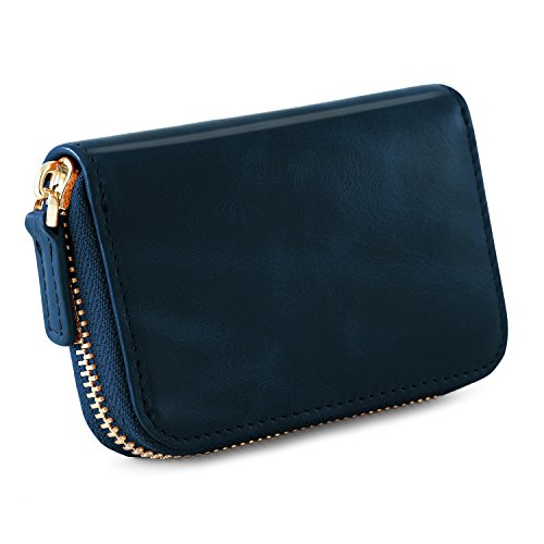 -. Feature : Retro style waxed cowhide genuine leather / Round zipper closure / 10 Card slot pockets, each can fit 2 or more cards / 2 large cash pockets, convenient to hold some cash, coins or keys / RFID Blocking Protection, Be Safe and Protected from Electronic Pick pocketing: Safe, Secure, Blocking protection from RFID scanners and readers