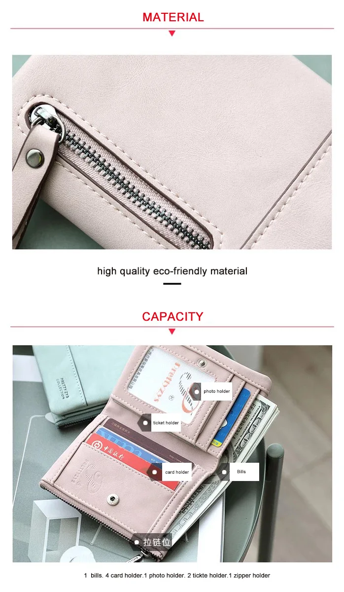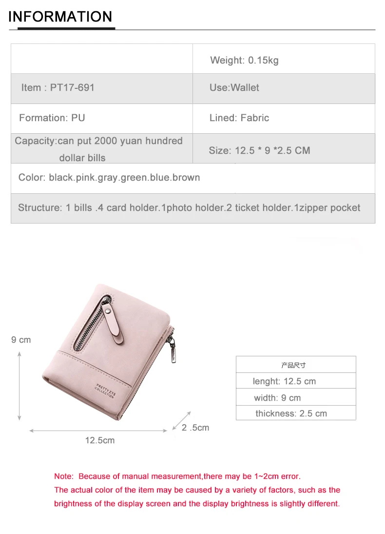 Inner structure::1 bills. 4 Card holder.1 photo holder.2 ticket holder.1zipper holder