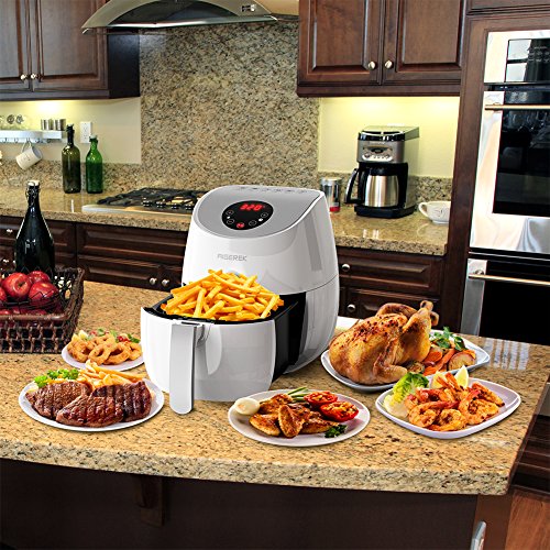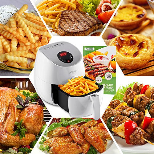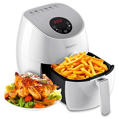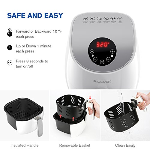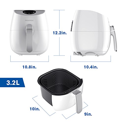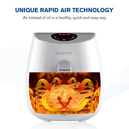 AIGEREK Airfryer frying basket has a large 3.2 liter capacity. You can cook all of your favorite fried delights quickly and evenly such as french fries (frozen and home made), bread crumbed cheese snacks, chicken nuggets, chicken fillet, steak, pork chops, hamburger, frozen fish fingers, muffin and more. Accurate temperature control and precise Timer are adjustable during frying. Once the set time has expired, you can hear a signal tone and the green LED turns off. It's more convenient. The frying basket and the frying pot can be easily washed in warm soapy water or wash in the dishwasher.