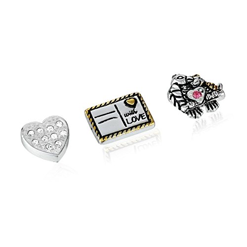 Locket 24" chain, two tone bird charm with pink crystal accent, two tone postcard charm, and clear crystal heart charm.