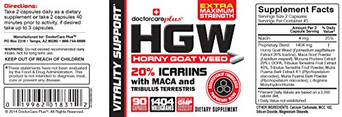 GET: Maximum Potency and Superior Performance from the most powerful formulation ever! By combining the most effective ingredients we've created the ultimate HGW Formula Maca Root - Tribulus Terrestris - L-Arginine - Mucuna Pruriens (L-DOPA) and the most important Standardized 20% Icariins.**500 mg of MACA ROOT & 500 mg of ICARIINS PER SERVING, 2X more than the closest competitor. Be critical and look at the ingredients of the top sellers of HGW, you'll see they all have the same weak formula.