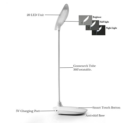GranVela Gooseneck Tube Touch Sensitive Switch 3 Brightness Levels, LED USB Rechargeable Dimmable Portable Lightweight Desk Table Book Reading Study Bedside Lamp Light-White B01APAUXN8