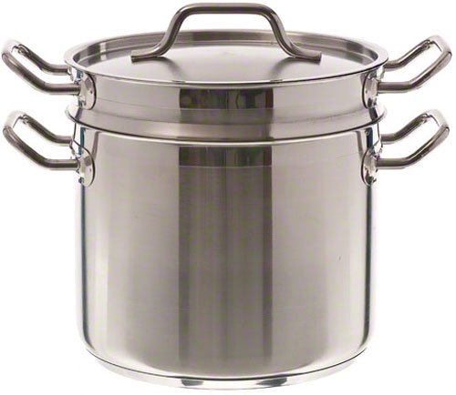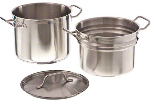 This induction ready double boiler with cover is constructed of stainless steel. These are essential in preparing some ingredients to be used in cooking. Features a natural finish. It is able to be used on an induction range. Comes with 8-quart capacity. Boiler measures 10-1/16-inch diameter by 7-11/16-inch depth. Insert measures 10-inch diameter by 6-7/8-inch depth.Feature