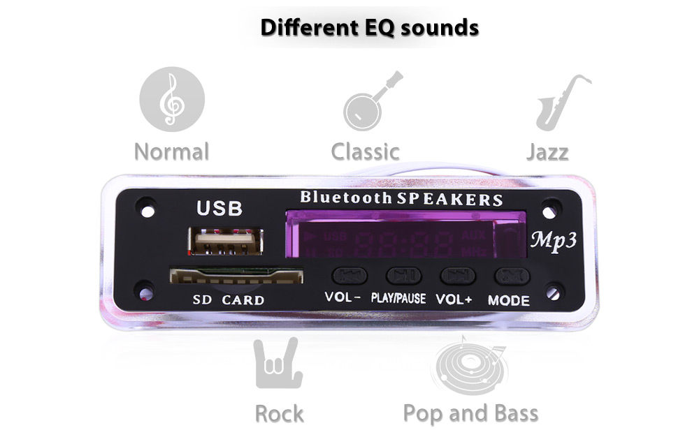 - Support 6 kinds of EQ sounds: normal, classic, jazz, rock, pop and bass