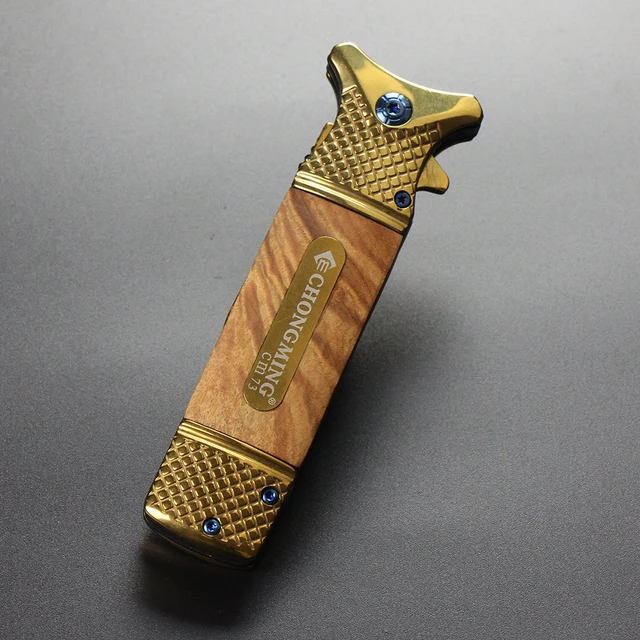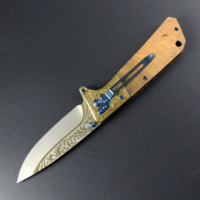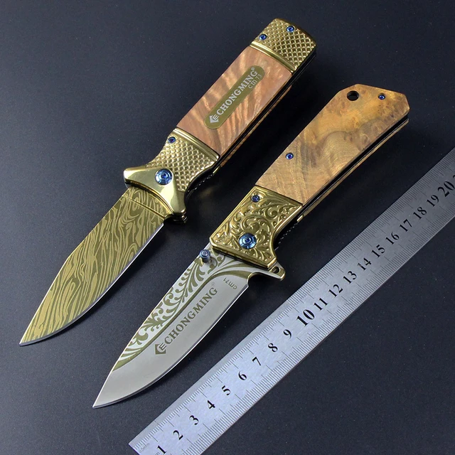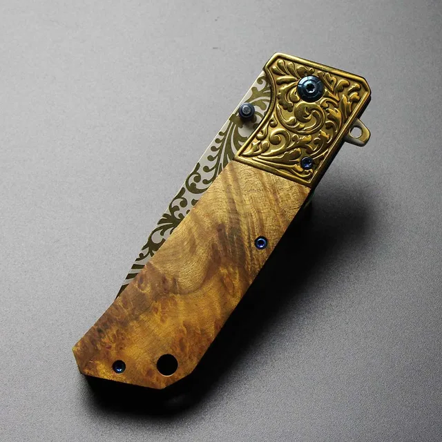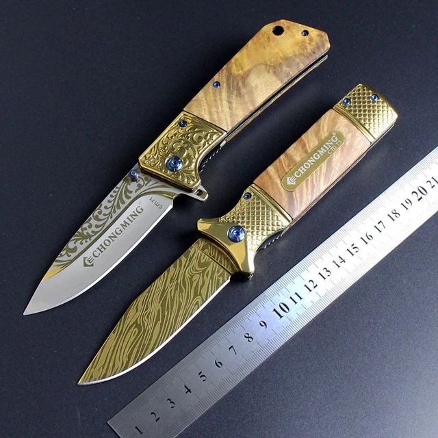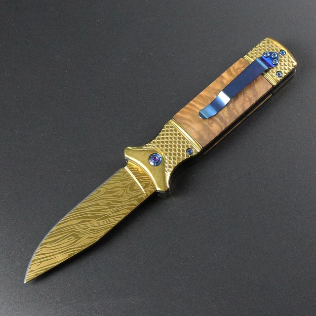 | [해외] 골드 도금 표면 사냥 접는 칼 스틸 + 나무 핸들 캠핑 도구 서바이벌 나이프 휴대용 야외 구조 EDC 도구 |