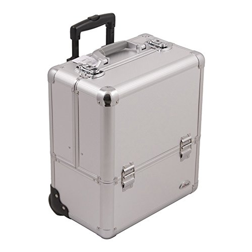 High quality aluminum finish and construction. Beautiful new silver dot pattern with silver aluminum trimming. Wider opening at top of the case for easy access. Heat resistant exterior material keeps the case cool and protects your tools. Eight extendable trays with spacious interior with removable custom tray dividers. Large center storage compartment with removable/adjustable dividers. Heavy duty handle for added comfort and grip. 2 secure easy close latches with key locks. Retractable/telescoping handle for extra durability with inline skate wheels for easy rolling. Telescoping handle fully extended height: 36.5". Extendable trays dimension (LxWxH): 12.25" x 3.5" x 1.5". Large center compartment dimension (LxWxH): 13.25" x 7.75" x 7". Overall case dimensions (LxWxH): 14" x 8.75" x 16".Feature