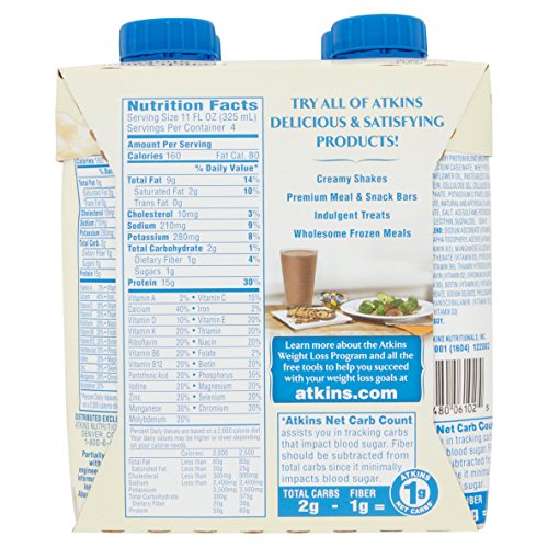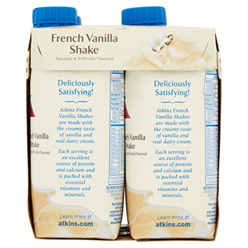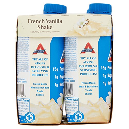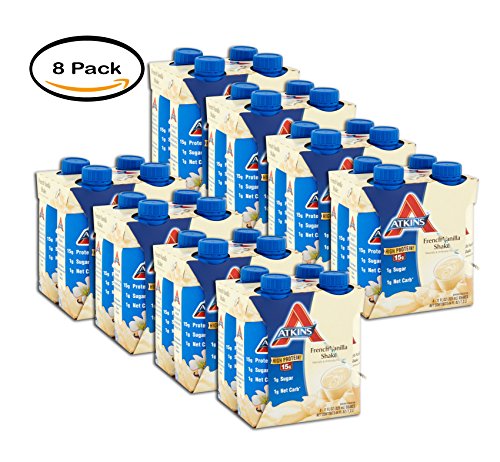 -. Binding : Health and Beauty -. Brand : Atkins -. EAN : 0764575302302 -. Feature : Creamy vanilla flavor. / 15g Protein. 1g Sugar. 160 Calories. 1g Net Carb. / Excellent Source of Calcium. / No Added Sugar. / Packed with essential Vitamins and Minerals. Each serving is 11oz. Available in a 4-pack. -. IsAdultProduct : 0 -. Label : Atkins -. LegalDisclaimer : Actual product packaging and materials may contain more and different information than what is shown on our website. We recommend that you do not rely solely on the information presented and that you always read labels, warnings, and directions before using or consuming a product. -. Manufacturer : Atkins -. MPN : 458364 -. PackageQuantity : 8 -. PartNumber : 458364 -. ProductGroup : Health and Beauty -. ProductTypeName : HEALTH_PERSONAL_CARE -. Publisher : Atkins -. Studio : Atkins -. Title : PACK OF 8 - Atkins Ready To Drink Shakes French Vanilla 4-counts -. UPC : 764575302302