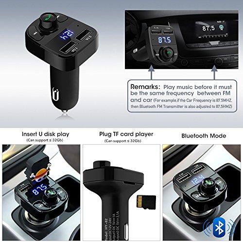 - 【USB FLASH PLAYER】Insert a USB flash driver which contains MP3 files into the “RIGHT” USB port, then it will transmit and play the MP3 files automatically (Up to 32GB); Multi-function Button Control: Play/Pause, Previous/Next song, Volume up/down; answer/reject calls, redial call; Support TF card for Playing music