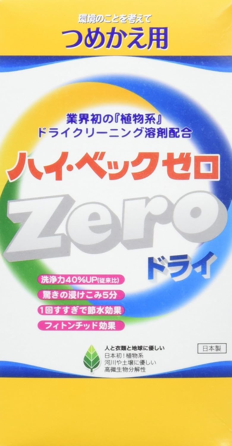 ドライマーク衣類を家庭で洗える洗濯用合成洗剤「ハイ・ベックZero」と併用してお使い戴く、おしゃれ着の仕上げ剤です。ドライマークのついているファッション性を重視して作られた衣類には、原反の段階で様々な加工(形態安定加工、ツヤ出し加工、防シワ加工、撥水加工など)が施されています。これらの加工は衣類を包む薄い膜のようなものですから、洗濯することにより、汚れとともに、どんどん薄れてしまいます。ハイ・ベックゼロ仕上げ剤を使用する事により、衣類に新品のようなハリやツヤ・風合いをよみがえらせる効果をもっています。