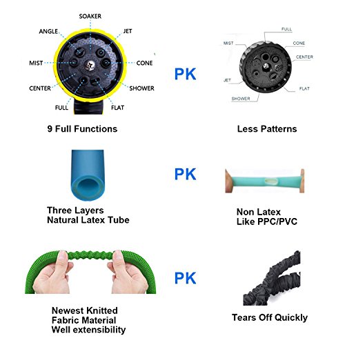 - 【Expandable To 50FT】The innovative inner latex pipe can be extended to 3 times of its original size (From 17FT to 50FT), works properly under the pressure of 4-8bar (60-115PSI) to prevent explosion, leakage, crack and corrosion.Garden hose comes with 3/4 Inch Tap.