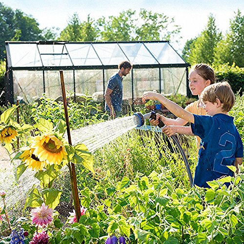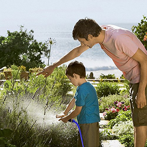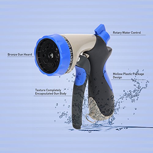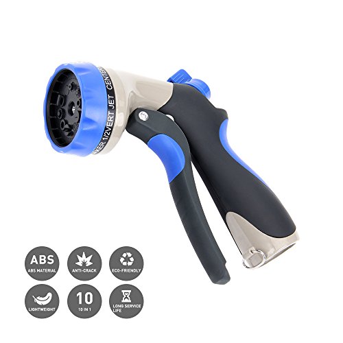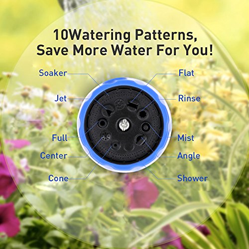 - 10 SPRAY PATTERNS - Jet, Mist, Shower, Flat, Full, Center, Cone, and Angel, Rinse, Soaker. Turn the spray nozzle dial for Easy Head Adjustments to choose appropriate pattern easily with a blue faucet on the handle.