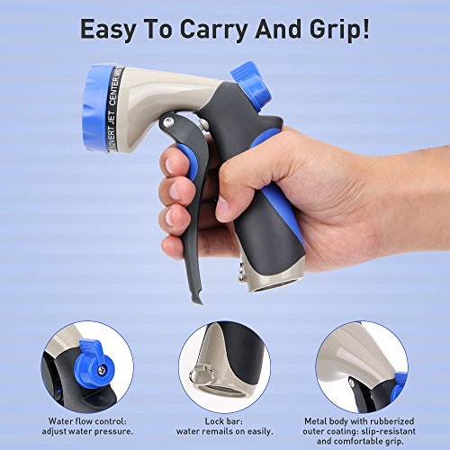 - ERGONOMIC COMFORT HANDLE and ADVANCED MATERIAL - Heavy Duty Textured Rubber Finish for a Comfortable Feel and Slip-Resistance Trigger. Made of metal body with rubberized outer coating, this hose nozzle is easy to grip, slip-resistant and comfortable fit. And the garden hose nozzle is much more DURABLE than the plastic one.