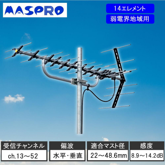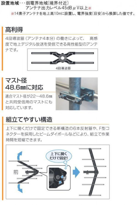 | 4段導波器(アンテナ4本分)の働きによって地上デジタル放送を高感度で受信できる、高性能アンテナです。組立てやすい構造で、適合マスト径が22~48.6mmと共同受信用のマストにも対応していますから、設置場所を選びません。 |