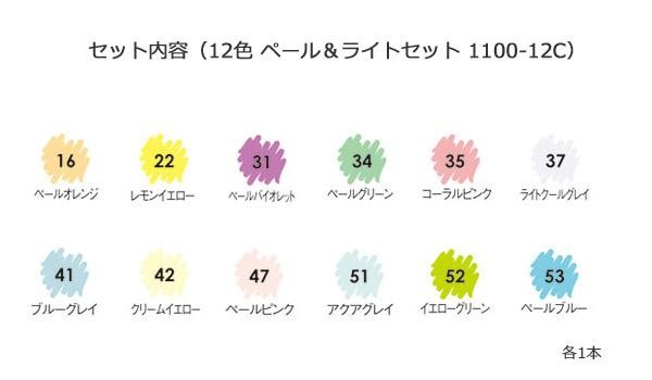 | セット内容 | ペールオレンジ(16)、レモンイエロー(22)、ペールバイオレット(31)、ペールグリーン(34)、コーラルピンク(35)、ライトクールグレイ(37)、ブルーグレイ(41)、クリームイエロー(42)、ペールピンク(47)、アクアグレイ(51)、イエローグリーン(52)、ペールブルー(53) (各1本) |