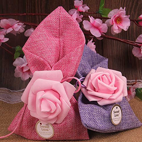 - These burlap bags with drawstring are unique with decorative foam flower and satin string for party ornaments.