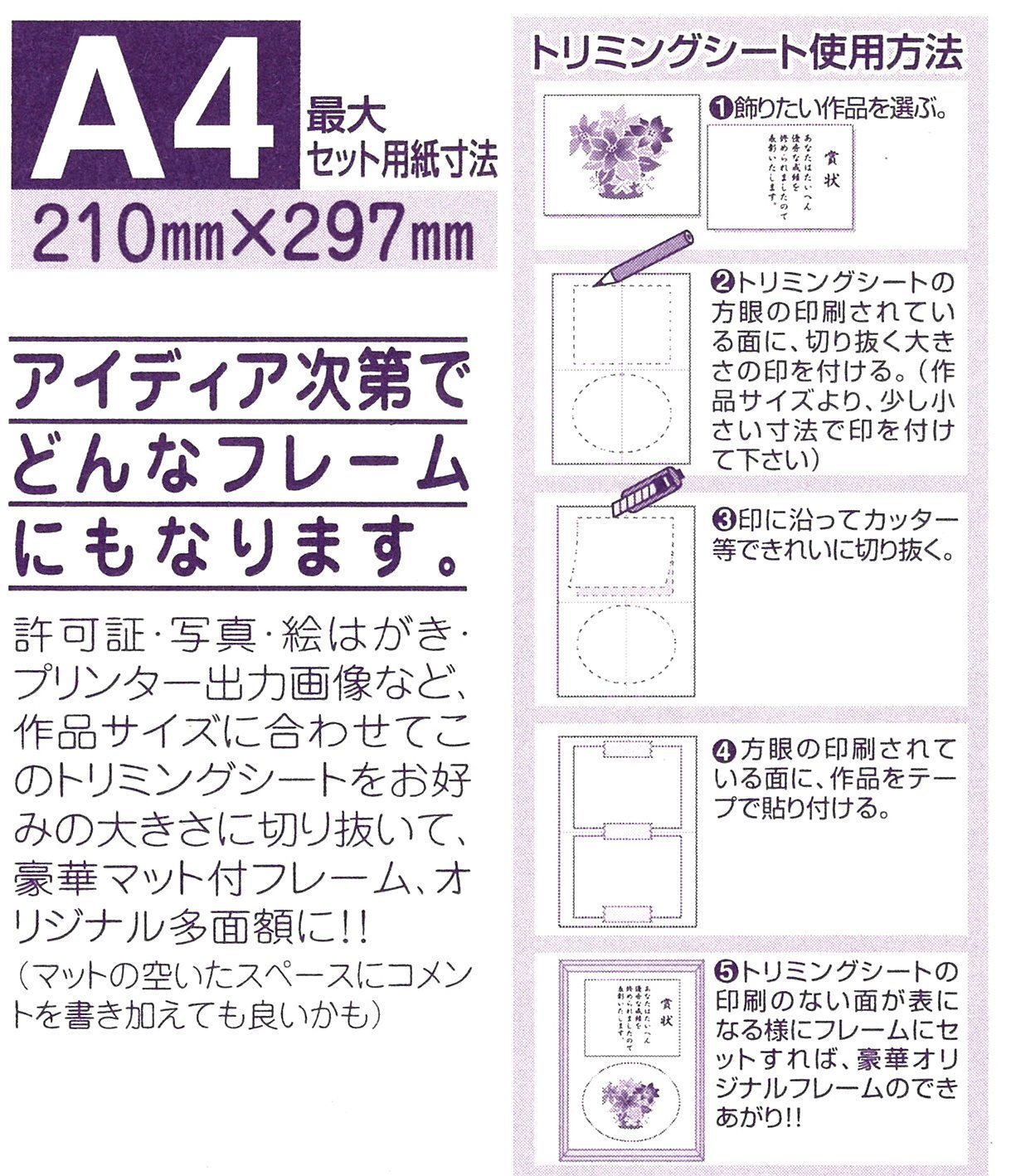 Since the trimming sheet (guide gridded sheet) is attached, you can use it as a matted frame and multifaceted forehead by cutting and decorating.