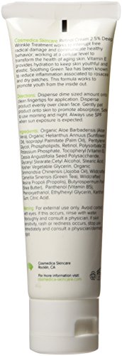 -. Binding : Misc. -. Brand : Cosmedica Skincare -. EAN : 0736631276605 -. Feature : KEY ACTIVES - ALOE, works to health imperfections and damaged skin; JOJOBA, nutrient rich and hydrating benefits; GREEN TEA, active caffeine, antioxidant and anti-inflammatory activities, polyphenols are likely to slow down the development of some signs of aging; B5 and Vitamin E, offers youth supplementing nourishment and hydration. / MILD EXFOLIANT - Mild exfoliation under the dermal layer of skin, Vitamin A works to promote cell turnover and collagen production by communicating youthening activity. / COMPLEXION CONTROL - Controlled and balanced formulation with Natural and Organic ingredients. Leaves skin dewy and refreshed, never oily or greasy. Safe for daily use with SPF 30+. / COMPLETE HYDRATION - Results driven active ingredients provide the benefits of Retinol without drying or irritation. 71% Organic Ingredients. / LIFETIME WARRANTY- complete customer satisfaction; no questions asked - All Products Made in USA - Cruelty Free - Paraben Free -. Label : Cosmedica Skincare -. Manufacturer : Cosmedica Skincare -. Model : Retinol_C_2 -. MPN : Retinol_C_2 -. NumberOfItems : 1 -. PackageQuantity : 1 -. PartNumber : Retinol_C_2 -. ProductGroup : Beauty -. ProductTypeName : BEAUTY -. Publisher : Cosmedica Skincare -. Size : 2 Ounces -. Studio : Cosmedica Skincare -. Title : Retinol Cream (2.5%) - Daily Retinol Moisturizing Facial Lotion - Active Gentle Resurfacing Cream with Vit A, Clinically Proven Restorative and Anti-Aging Properties - 2 oz -. UPC : 736631276605