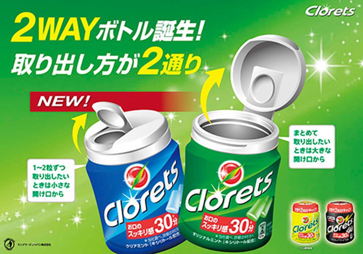 ボトルに大小2つの開け口がある、「2WAYキャップ」を採用。ボトルの中のガムに直接触れたくない場合には小さな開け口から取り出すなど、お好みで取り出し口が選べる便利な仕様になっています。