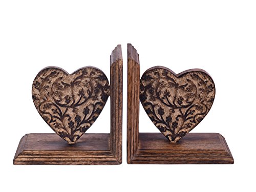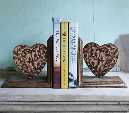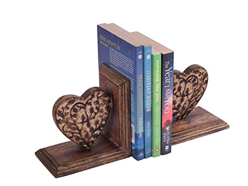 Store Indya,Hand Carved Wooden Heart Shaped Floral Book Ends Rack Display CD DVD Stand Holder Organizer Bookend Pair Bookshelf For Home Office Decor