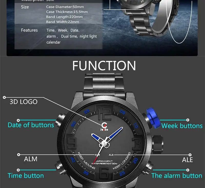 Feature:Water Resistant,Auto Date,Shock Resistant,Alarm,Luminous Hands