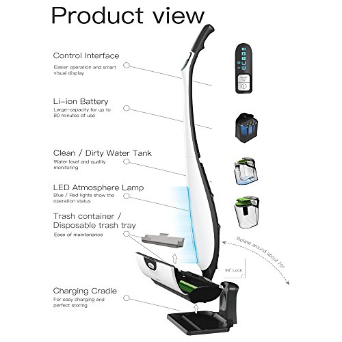 -. Feature : INNOVATIVE DUAL-CLEANING TECHNOLOGY: Combines wet and dry cleaning in one super-efficient appliance for easy cleanup of dirt, grime and spills. / AUTOMATICALLY SEPARATES WASTE: Divides solid from liquid waste for easy disposal and to avoid clogging drains. / ENERGY-SAVING, LONG-LIVED BATTERY: High-capacity lithium-ion battery lasts for up to 60-80 minutes while using less electricity, long lasting power plus energy efficient, comes with its own 24-hour standby charging station. / LOW-NOISE: Whisper-quiet operation won't disturb pets, babies or neighbors. / FANTASTIC 4-IN-1 CLEANING FUNCTION: Integrates sweeping, mopping, drying, and self-cleaning in one convenient cord-free appliance, definitely an excellent partner for your vacuum.