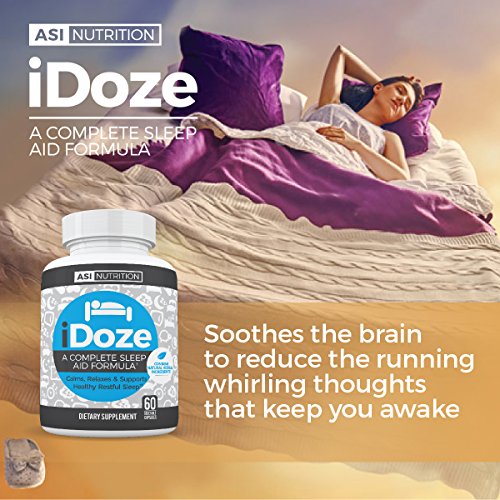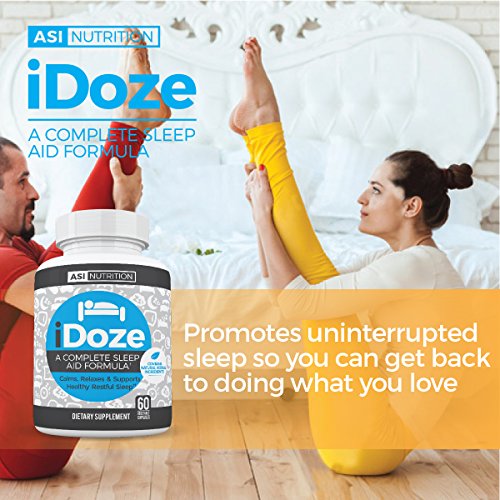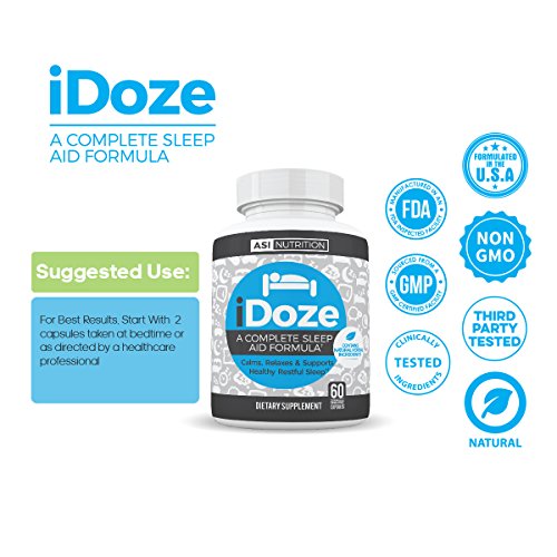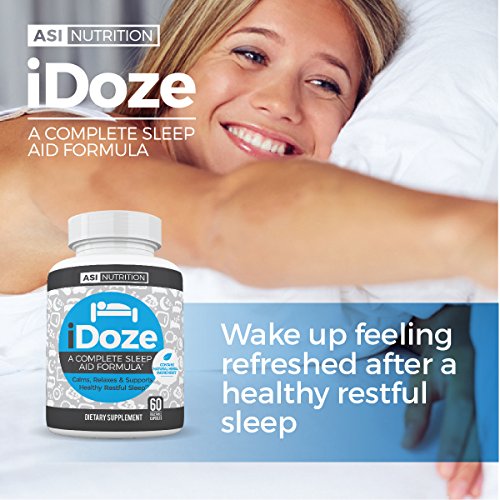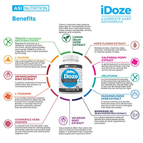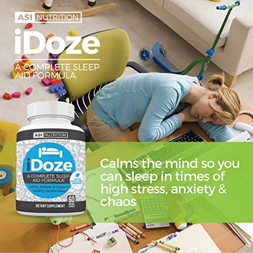 Having trouble falling asleep at night? Are you nervous and anxious? Maybe your stress is causing poor sleep? The solution is here! Our natural herbal sleep aid by A.S.I. Nutrition, iDOZE! This product is great for not only getting to sleep quicker, but staying asleep as well! iDOZE has the right combination of natural ingredients to reduce the time needed to fall asleep. Packed with 10 all natural herbal extracts and ingredients that promote sleep by calming the nerve cells in the brain. iDOZE helps stop the constant whirling, running thoughts in the middle of the night so you can get back to sleep faster. It also promotes a calm relaxed state and helps you unwind so you can fall asleep sooner. iDOZE helps treat insomnia when stress or anxiety is a contributing factor and helps improve sleep quality and duration. Magnesium L-Threonate & Taurine calm the nervous system while Lemon Balm & California Poppy calms anxiety and restlessness to improve sleep! Ashwagandha & Magnolia Bark helps combat early morning awakenings. Make the choice to sleep better, so you can live better! We put 100% into satisfying each and every new and loyal customer! So what are you waiting for? Invest in yourself! Click on the 'add to cart' button while supplies last!Feature