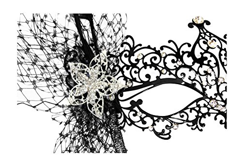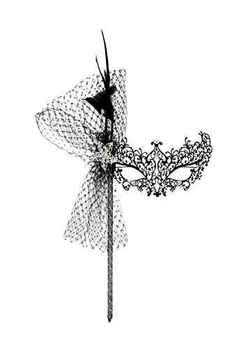 Odette is a Elusive. The Classic Luxury Black Laser Cut Metal Masquerade Bejeweled mask is adorned with crystal jewels. The jewels are sprinkled all over the mask like little stars. The side has an a puff of diamond net, exotic feathers, and a beautiful star rhinestone brooch. It comes on a Deluxe 10 inch clear mesh covered stick. Our original designs are beautifully hand-decorated in the USA by our talented artists.Feature