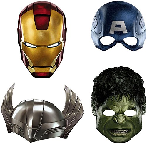 Package includes (4) Avengers Masks. One size fits most kids. This is an officially licensed Avengers product. The Avengers Masks are made of heavy paper, and are printed in a way that makes them look realistic. A soft elastic cord holds our The Avengers Masks comfortably on one's face. Boys love to pretend to be super heroes. Be sure each guest has his own The Avengers Mask to wear during the party, and don't forget to get a group shot of all of your Avengers.Feature