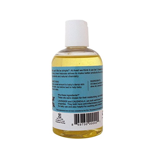-. Feature : 100% Natural Oil with organic sunflower and jojoba oil. Great daily moisturizer for moms too! No petroleum products or mineral oil so it allows skin to breathe while it hydrates. / Natural lavender and calendula are anti-inflammatory and healing and will help treat baby's dry, chapped skin and baby eczema. / Relaxing scent is great for before bedtime routine and perfect for baby massage! Use after your baby's bath to seal in moisture and protect their skin from the elements. Also safe for treating cradle cap. / Gentle enough for daily use. Sunflower oil has been used in hospitals for preterm infants as a skin barrier protection since their skin is so delicate. Use this oil daily on baby's bum along with the Averi Naturals Healing Baby Powder and you'll never have to face diaper rash again! / Chemical Free, Paraben free, polysorbate free, disodium EDTA free, vegan, petroleum product free, cruelty free